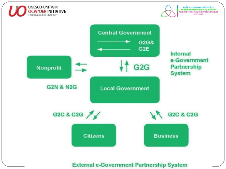 � Govemment-to-Govemment (G 2 G) - davlat boshkaruv organlarining uzaro alokalariga yunaltirilgan shakl; � Government to Business (G 2 B) - davlat boshkaruv organlari bilan tadbirkorlik sub’ektlari urtasidagi uzaro munosabatlarga yunaltirilgan shakl; � Government to Citizens (G 2 C) - davlat boshkaruv organlari bilan fukarolar urtasidagi uzaro munosabatlarga yunaltirilgan shakl; � Government-to-Non-profit (G 2 N) - davlat boshkaruv organlari bilan notijorat tashkilotlar urtasidagi uzaro munosabatlarga yunaltirilgan shakl; � Government-to-Employee (G 2 E) - davlat boshkaruv organlari bilan uning xodimlari urtasidagi uzaro munosabatlarga yunaltirilgan shakl;