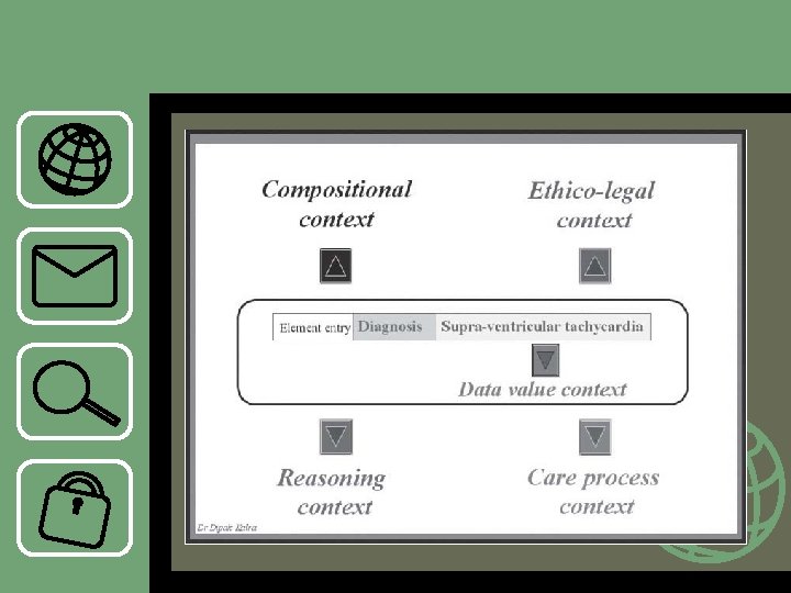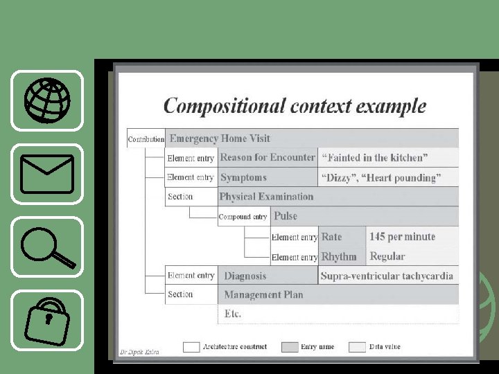 Compositional context • Terdapat beberapa segi dari konteks ini yaitu • Setiap record entry harus dapat menunjukkan entry nama • Record entry dapat berupa elemen misalnya berat badan atau komponen misalnya tekanan darah • Hirarki struktur formal dari record harus menjamin dimana entry benar-benar dilakukan digolongkan oleh pengarang. • Arsitektur record harus menegaskan medicolegal, penerimaan kohort data dari EHR harus difikirkan