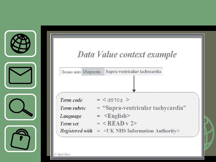 Data value contact • Konteks ini mengacu pada detil yang baik berkaitan dengan pemilihan nilai tersebut. EHR membutuhkan berbagai macam data termasuk – teks, kuantitas, waktu, orang, multimedia – nama terminologi, versi dan registrasi agency – bahasa yang biasa dipakai ketika merekam data – range normal