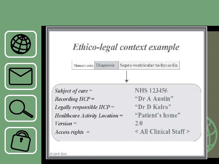 Ethico-legal context • Sebagai contoh pembaca dapat memastikan bahwa data telah direvisi dari aslinya, yang berarti terdapat kesalahan dalam pencatatan dan telah dikoreksi (akses ke versi yang asli harus lebih sulit daripada versi yang terbaru). Macam konteks ini termasuk: – mengidentifikasi pengarang, agen yang berwenang dan tangungjawab legal untuk dokumentasi pelayanan kesehatan. – Identifikasi subyek pelayanan, dan subyek informasi dari yang diisikan tiap entry – Tanggal dan waktu dari pengisi record, transfer pelayanan dan kejadian yang dicatat. – Kontrol versi. – Hak akses, hak amandemen.