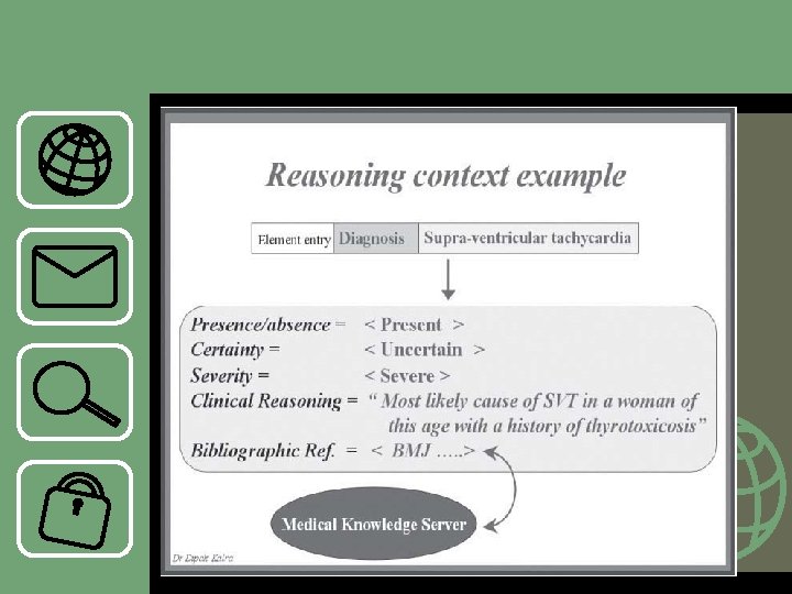 Care process context • Konteks ini berkaitan dengan link dan ponter yang membantu untuk menampilkan non kronologis dari rekam kesehatan. • Potensial link dan pointer yang harus terdapat dalam EHR adalah : – – – – Sebab dan akibat Permintaan dan hasil Status proses Definisi masalah Episode perawatan Jalannya protokol Decission support systems (6)