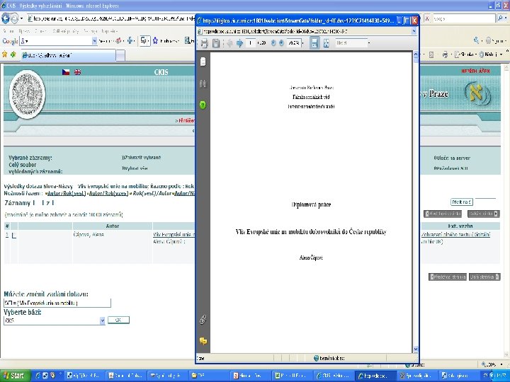 VŠ práce Propojení s Digitálním univerzitním repozitářem, možnost prohlížení e-verzí prací přímo z CKIS n Omezeno na IP adresy UK, testuje se autentikace pomocí LDAP, vzdálený přístup přes EZProxy n Propojení pomocí pole 856 n