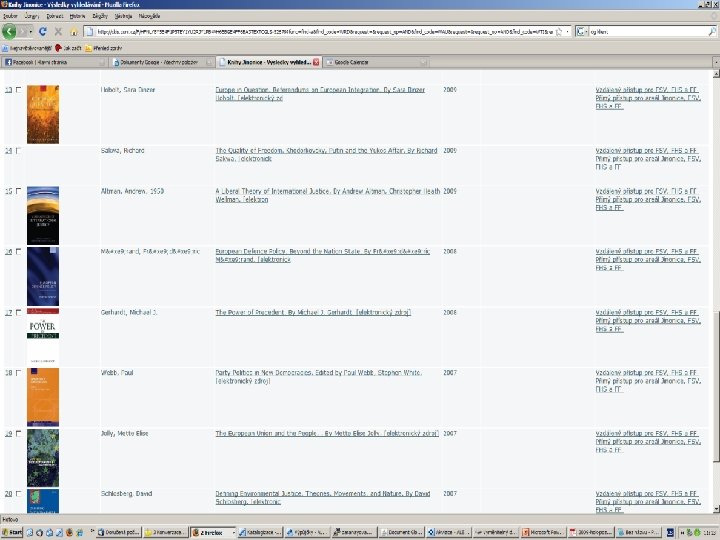 Vzdálený přístup Většina zdrojů zpřístupněná přes IP adresy n Vzdálený přístup buď pomocí VPN nebo EZProxy, u záznamů e-books je uveden link pro vzdálený i přímý přístup n Je plánované propojení Alephu s LDAP – uživatel nebude muset nic instalovat ani se přihlašovat do EZProxy, bude stačit se přihlásit do svého uživatelského konta n