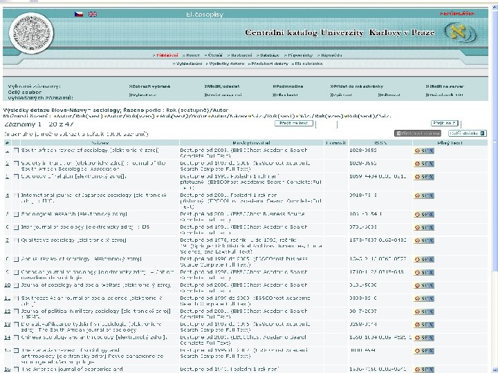 E-journals n n n Pravidelné importy (1 x měsíčně) pomocí technologie SFX, záznamy obohacené službou Marc. It! Časopisy přístupné na celé UK i předplácených v jednotlivých knihovnách UK (pomocí Verde/SFX) Pouze předplácené časopisy z databází, volně dostupné zdroje odstraněny (uživatelé hledají pomocí jiných služeb - Google)
