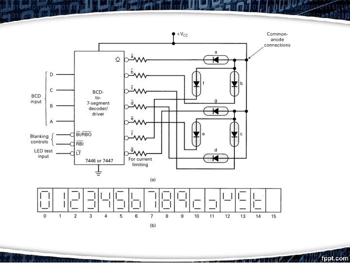 DECODERS: BCD TO 7 -SEGMENT DECODER/DRIVER Decimal output LED BCD input 0 00 11 01 0 BCD-to 7 -Segment Decoder/ Driver Electronic decoders are available in IC form. • This decoder translates from BCD to decimal. • Decimals are shown on an 7 -segment LED display. • This IC also drives the 7 -segment LED display. •