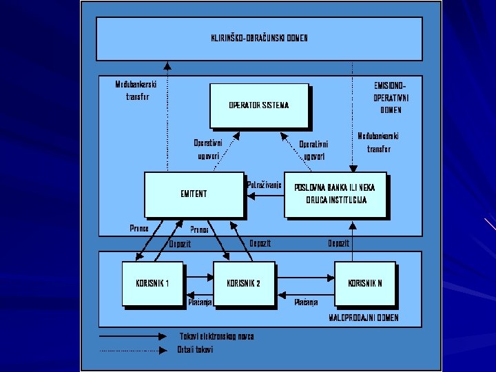 OPŠTI MODEL SISTEMA ELEKTRONSKOG NOVCA U njemu se mogu identifikovati tri zasebna domena: (1) Obračunsko-klirinški domen (2) Emisiono-operativni domen (3) Maloprodajni domen