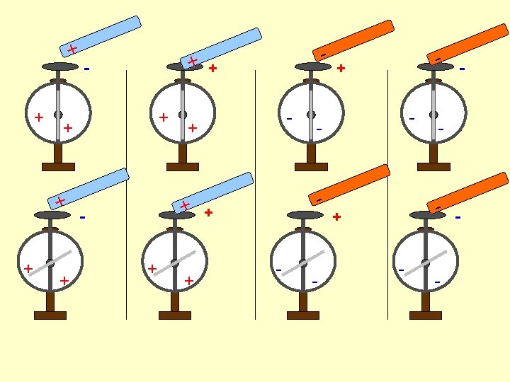 Platí : 1. ak priblížime k E kladne nabitú tyč pritiahne voľné elektróny z dolnej časti otočnej a pevnej tyčky Hore a budú obe kladne nabité. Po oddialení tyče sa elektróny opäť rovnomerne rozložia a otočná tyčka sa vráti do zvislej polohy 2. Ak sa dotkneme E kladne nabitou tyčou presunú sa voľné elektróny z E na tyč a E bude kladne nabitý a zostane ním aj po oddialení tyče.