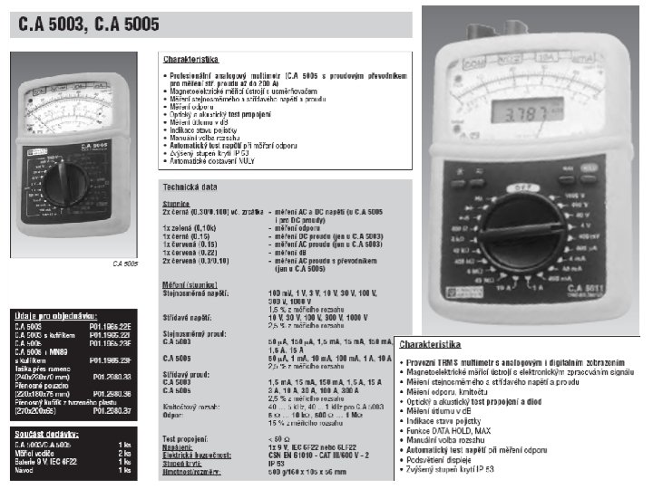 Digitální multimetry Základní vlastnosti: * jednodušší konstrukce (nejsou pohyblivé mechanické části) * větší uplatnění provozní měření, menší možnost mechanického poškození * jednodušší odečítání * podle typu více funkcí, možnost dalšího zpracování dat (PC) * vysoká vstupní impedance * přepínání rozsahů (U, I, R) ruční nebo automatické * možnost ochranných funkcí (při špatném zapojení) * měřené střídavé veličiny RMS nebo TRMS * přesnost je dána zejména použitý A/D převodníkem digitální multimetr nemusí být přesnější než analogový