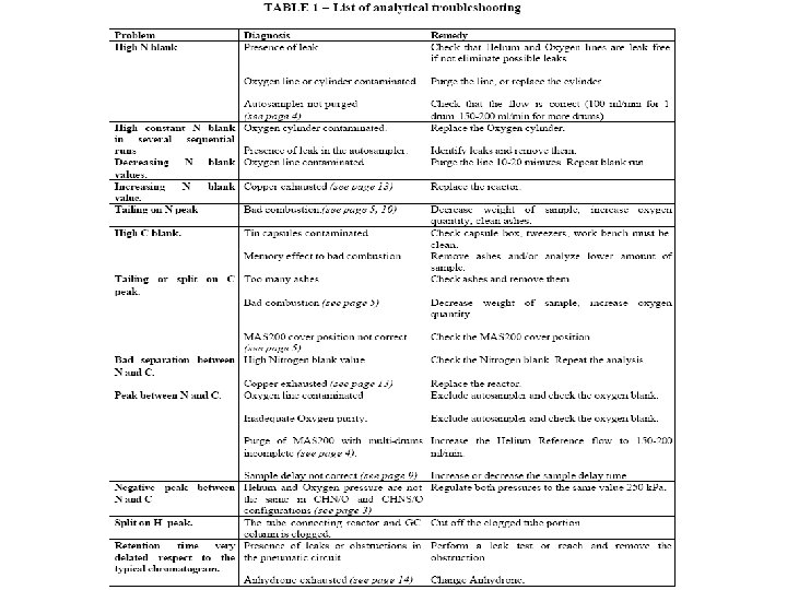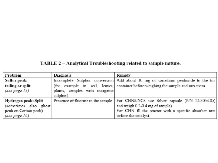 Bad combustion of sample due to: high weight of sample, required oxygen not sufficient, too many ashes catalyst exhausted. Trouble: Tailing on Nitrogen peak Bad separation between Nitrogen and Carbon peaks Split or tailing on C peak Solution: Decrease the weight of sample, increase the oxygen quantity, clean the ashes, change the catalyst.