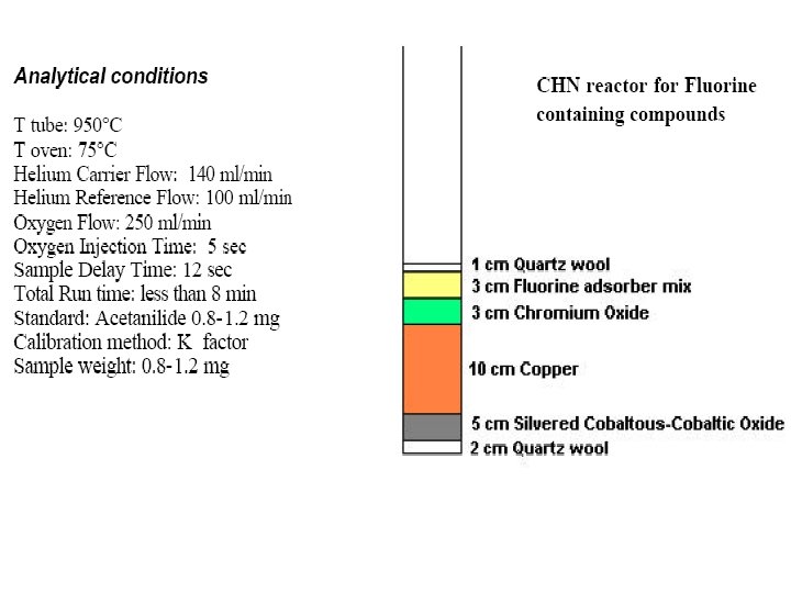 Split on Hydrogen peak: Presence of fluorine containing compounds The analysis of Fluorine-containing compounds shows many difficulties due to the high reactivity Troubles: Tailing or splitting on Hydrogen peak Ghost peaks on Carbon peak Solution: For CHN configuration: -fill a reactor with the specific absorber Fluorine mix For CHNS configuration: - to reduce the problem, weigh 0. 4 -0. 6 mg of sample in a Silver capsule (P/N 24005405).