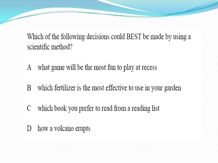What is a scientific question? Many questions that scientists ask begin with What, How, When, Where or Why Scientific questions can be answered by gathering observations or measurements, called data Some questions are not scientific because they mean different things to different people, no data can be gathered to answer these questions How man Sat y ring urn s hav does e? th tier ret p urn ars? t a M Is S an