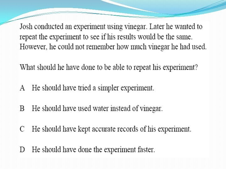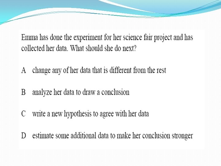 Does any data answer the question? Scientists must make sure that their data matches the question that was asked If the question asks what kind of seed a canary prefers, the experiment must test different seeds, not different times of feeding the canary If a question asks what kind of grass is fastest for soccer, the experiment must test different types of grass, not different balls I Wha do c t type o f ana ries seeds pref er? llows a a s s a r g f o What type ster? a f e v o m ll to soccer ba
