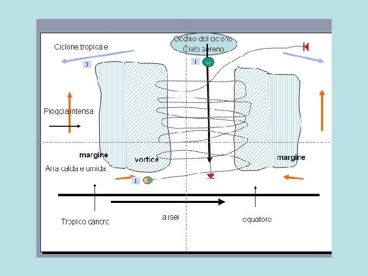 Occhio del ciclone Cielo sereno Ciclone tropicale Pioggia intensa margine vortice Aria calda e umida alisei Tropico cancro equatore alisei