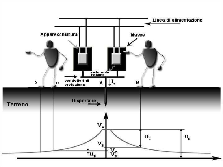Tensione di contatto La tensione di contatto Vc è la d. d. p. che si può istaurare tra mani e piedi di una persona in contatto con la carcassa metallica messa a terra e andata in tensione per un cedimento dell’isolante. VC =h. Vt (h<1) è una frazione di Vt e dipende da I e da ρ. Nella fig. successiva la tensione di contatto è indicata come Uc e quella di terra come Ut
