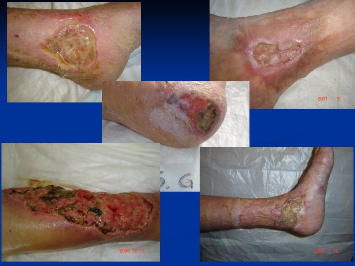 Caratteristiche dell’ulcera arteriosa n Sede: si localizza preferenzialmente al piede o regione antero laterale gamba ( metatarsi , dita, calcagno, terzo distale gamba ) , spesso determinate da pressione della calzatura, inappropiati pedicure, traumi, infezioni delle dita n Cute pallida, atrofica, ipotermica, alterazione annessi cutanei