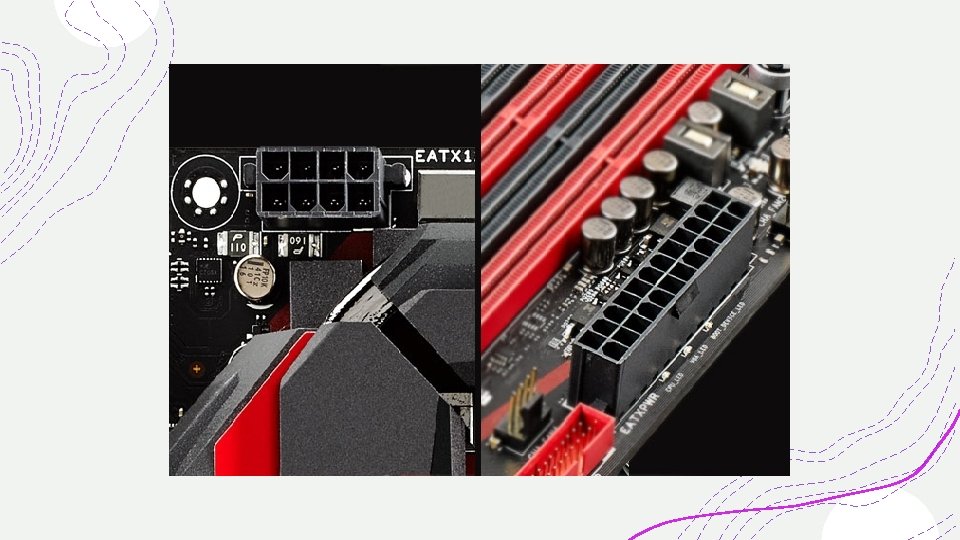 Konektori za napajanje predstavljaju tačke na koje se povezuju napajanja računara, kako bi se ploča i njene komponente snabdijevale strujom. U praksi, imamo 20+4 -pinski konektor na desnoj strani ploče, kao i 4+4 -pinski konektor, najčešće smješten blizu procesora. Njihova funkcija je jasna i jednoznačna.