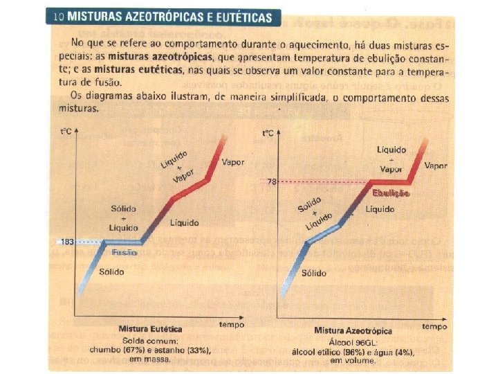 Unesp-2010 No campo da metalurgia é crescente o interesse nos processos de recuperação de metais, pois é considerável a economia de energia entre os processos de produção e de reciclagem, além da redução significativa do lixo metálico. E este é o caso de uma microempresa de reciclagem, na qual desejava-se desenvolver um método para separar os metais de uma sucata, composta de aproximadamente 63 % de estanho e 37 % de chumbo, usando aquecimento. Entretanto, não se obteve êxito nesse procedimento de separação. Para investigar o problema, foram comparadas as curvas de aquecimento para cada um dos metais isoladamente com aquela da mistura, todas obtidas sob as mesmas condições de trabalho. Considerando as informações das figuras, é correto afirmar que a sucata é constituída por uma a) mistura eutética, pois funde a temperatura constante. b) mistura azeotrópica, pois funde a temperatura constante. c) substância pura, pois funde a temperatura constante. d) suspensão coloidal que se decompõe pelo aquecimento. e) substância contendo impurezas e com temperatura de ebulição constante. A