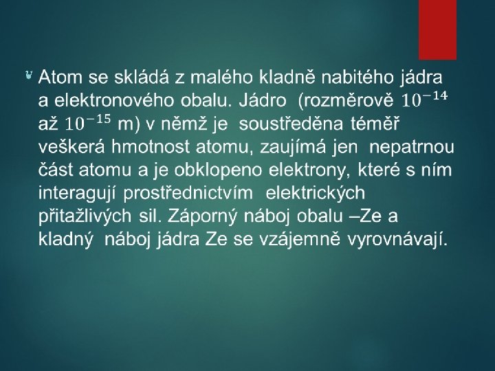 Otázky o Jaký je elektrický náboj elektronu? o Co zjistil Millikan svým pokusem? o Jak bylo objeveno atomové jádro? o Budeli mít atom rozměry sportovní haly (řádově stovky metrů), jaký v něm bude řádový rozměr jádra? o Určete střední hustotu látky v atomu vodíku a v jádře vodíku a srovnejte je s hustotou kapalného vodíku 71 g/m 3. Poloměr atomu 10 -10 m, poloměr jádra 10 -15 m.