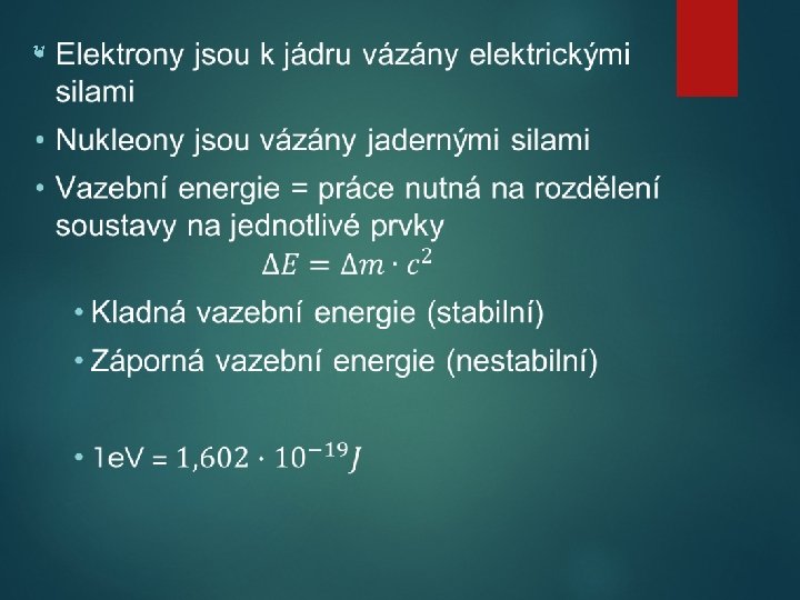Otázky o Co je jeden Me. V, Ge. V, Te. V, a jakému hmotnostnímu úbytku to odpovídá? o Jaký hmotnostní úbytek vznikne pří spálení jedné tuny černého uhlí o výhřevnosti 25 MJ/kg? o Vypočítejte energii, která by se uvolnila, kdybychom složili 1 kg Uranu 238