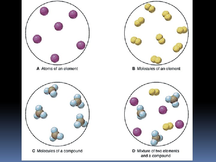 Representations of Atoms, Molecules and Compounds Atom- represented by a circle that is ONE color OR ONE pattern Compound- represented by TWO or more DIFFERENT colored circles, DIFFERENT size circles, OR DIFFERENT patterns in the circles But are ATTACHED together