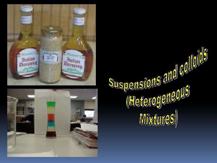 Types of substances Heterogeneous Mixtures 1. Not the same throughout 2. Large easily seen particles that can be separated out 3. Heterogeneous liquid mixtures known as suspensions Settles after standing 4. Tacos, salad, italian dressing, pebble/sand mixture