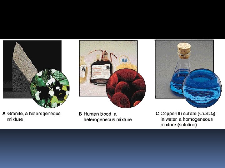 Types of substances Homogeneous Mixtures 1. Appears same throughout 2. Well mixed 3. Won’t settle upon standing, 4. Tiny unrecognizable particles 5. Type: Solutions