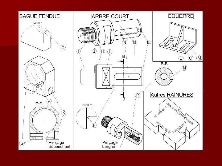 REP. VOCABULAIRE TECHNIQUE DES FORMES DEFINITION GENERALE A Alésage Forme contenante cylindrique ou non B Arbre Élément contenu cylindrique ou non C Arrondi Surface à section circulaire partielle qui est destinée à supprimer une arête vive. D Bossage Saillie prévue sur une pièce afin de limiter la portée (surface d’appui) E Chanfrein Petite surface obtenue par suppression d’une arête sur une pièce F Congé Surface à section circulaire partielle destinée à raccorder deux surfaces formant un angle rentrant G Embase Élément d’une pièce destiné à servir de base H Epaulement Changement brusque de la section d’une pièce par usinage I Filetage Rainure(s) hélicoïdale(s) exécutée(s) à partir d’un cylindre ou d’un cône EXTERIEUR J Gorge Dégagement étroit généralement arrondi à sa partie inférieure K Lamage Logement cylindrique généralement destiné à « noyer » une tête de vis L Méplat Surface plane sur une pièce à section circulaire M Nervure Partie saillante d’une pièce servant à augmenter la résistance ou la rigidité N Rainure Entaille longue dans une pièce pour recevoir une clavette, une languette ou plus généralement un tenon O Trou oblong Trou plus long que large, terminé par deux demi-cylindres. P Taraudage Rainure(s) hélicoïdale(s) exécutée(s) à partir d’un cylindre ou d’un cône INTERIEUR