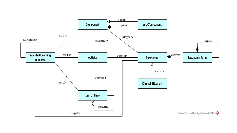 Elements of a curriculum Component: • the building blocks of the curriculum - a Component has a set of Intended Learning Outcomes and is delivered by Activities within a Unit-of-Time. • Example: Module Unit-of-Time: • any part of a hierarchical subdivision of the Component delivery time within the Programme. • Example: Year, Semester, Block Activity: • any teaching and learning activity which delivers Components of the Programme and has Intended Learning Outcomes. • Example: Lecture, Clinical Skills (lab and clinical workplace), Case Clinical Situation / Presentation: • a clinical condition or symptom that will be encountered during Activities. • Example: Acne, Dementia Intended Learning Outcome (ILO): • an item of assessable knowledge, skills or behaviour acquired during the Programme. • Example: To demonstrate knowledge of pain pathways, receptors and the neurotransmitters involved in differentiating between chronic pain and acute pain
