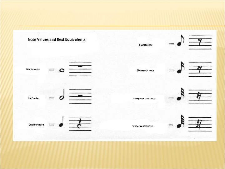 RHYTHM Beat - Steady recurring pulse Beats are broken down into various note values. Each note value is worth a set number of beats and also has a corresponding rest Whole Note - 4 Beats Half Note - 2 Beats Quarter Note - 1 Beat Eighth Note - 1/2 Beat