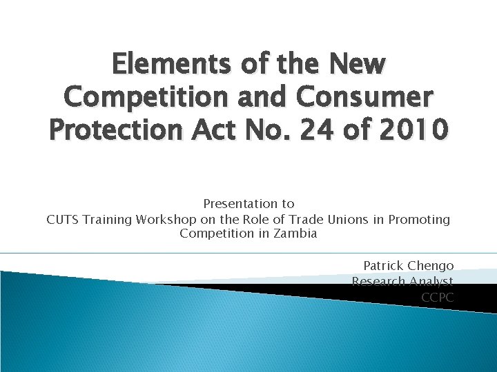Elements of the New Competition and Consumer Protection Act No. 24 of 2010 Presentation to CUTS Training Workshop on the Role of Trade Unions in Promoting Competition in Zambia Patrick Chengo Research Analyst CCPC