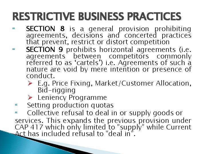 RESTRICTIVE BUSINESS PRACTICES SECTION 8 is a general provision prohibiting agreements, decisions and concerted practices that prevent, restrict or distort competition SECTION 9 prohibits horizontal agreements (i. e. agreements between competitors commonly referred to as ‘cartels’) i. e. Agreements of such a nature are void by mere intention or presence of conduct. Ø E. g. Price Fixing, Market/Customer Allocation, Bid-rigging Ø Leniency Programme Setting production quotas Collective refusal to deal in or supply goods or services. This expands the previous provision under CAP 417 which only limited to “supply” while Current Act has included refusal to “deal in”.