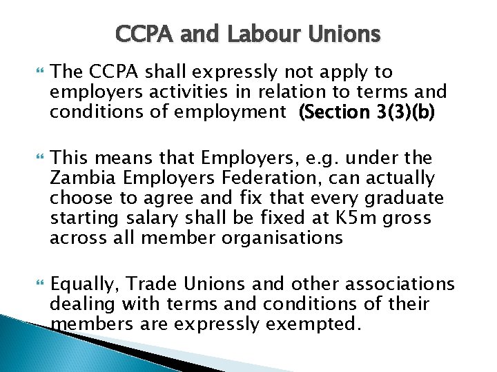 CCPA and Labour Unions The CCPA shall expressly not apply to employers activities in relation to terms and conditions of employment (Section 3(3)(b) This means that Employers, e. g. under the Zambia Employers Federation, can actually choose to agree and fix that every graduate starting salary shall be fixed at K 5 m gross across all member organisations Equally, Trade Unions and other associations dealing with terms and conditions of their members are expressly exempted.