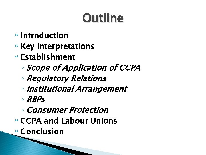 Outline Introduction Key Interpretations Establishment ◦ Scope of Application of CCPA ◦ Regulatory Relations ◦ Institutional Arrangement ◦ RBPs ◦ Consumer Protection CCPA and Labour Unions Conclusion