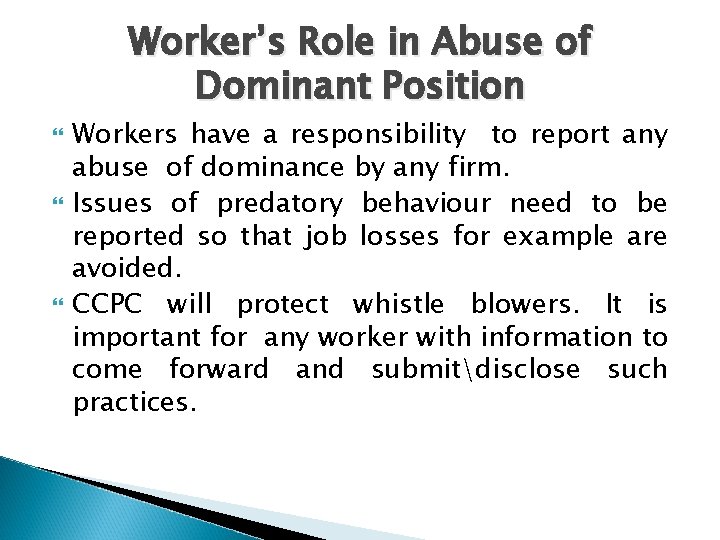 Worker’s Role in Abuse of Dominant Position Workers have a responsibility to report any abuse of dominance by any firm. Issues of predatory behaviour need to be reported so that job losses for example are avoided. CCPC will protect whistle blowers. It is important for any worker with information to come forward and submitdisclose such practices.