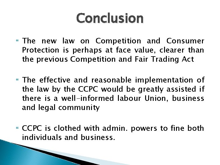 Conclusion The new law on Competition and Consumer Protection is perhaps at face value, clearer than the previous Competition and Fair Trading Act The effective and reasonable implementation of the law by the CCPC would be greatly assisted if there is a well-informed labour Union, business and legal community CCPC is clothed with admin. powers to fine both individuals and business.