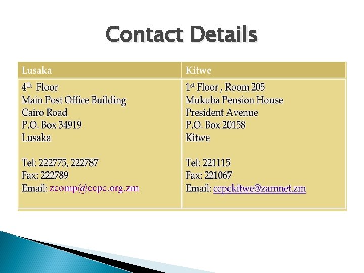 CCPA and Labour Unions Cont’d ◦ Cartelisation – may lead to high prices which then would affect workers disposable income/wages. Thus Labour/Trade Unions have a key role to play in the Enforcement of the CCPC such as; ◦ Being Watchdogs monitoring RBPs/Anti-Competitive Practices. ◦ Helping CCPC’ awareness on Competition and Consumer Protection through their Union structures in Provinces where CCPC faces challenges reaching them. ◦ Ensuring that Mergers & Acquisitions do no escalate job losses ◦ Using the Unions platform when engaging businesses to register displeasure of any spots of Anti-Competitive practices