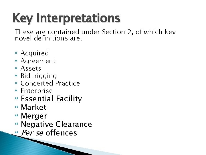 Key Interpretations These are contained under Section 2, of which key novel definitions are: Acquired Agreement Assets Bid-rigging Concerted Practice Enterprise Essential Facility Market Merger Negative Clearance Per se offences