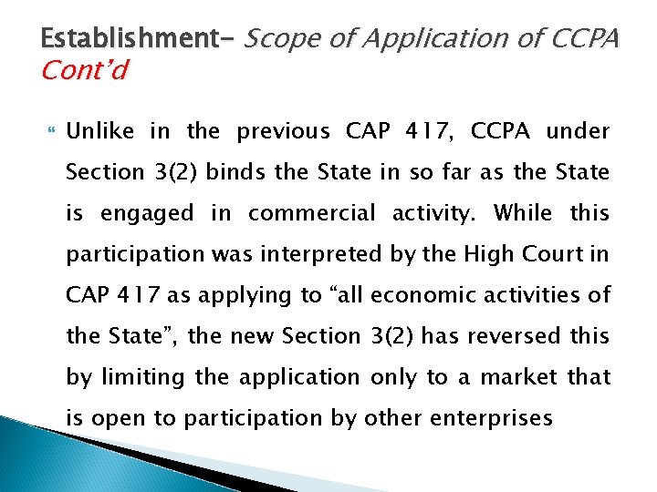Establishment- Scope of Application of CCPA Cont’d Unlike in the previous CAP 417, CCPA under Section 3(2) binds the State in so far as the State is engaged in commercial activity. While this participation was interpreted by the High Court in CAP 417 as applying to “all economic activities of the State”, the new Section 3(2) has reversed this by limiting the application only to a market that is open to participation by other enterprises