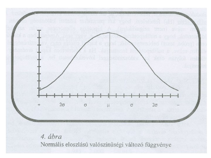 Normális eloszlás • A természetben az egyik leggyakrabban használt valószínűség eloszlás • Létrejöttéhez több feltétel egyidejű teljesülése szükséges • (μ-σ)*2=68. 27% (≈2/3) • (μ-2σ)*2=95. 44% • (μ-3σ)*2=99. 7%, tehát 1000 esetből 3 haladja meg a 3σ • A 3σ kívül eső érték rendszerint mérési hiba vagy szisztematikus hatás