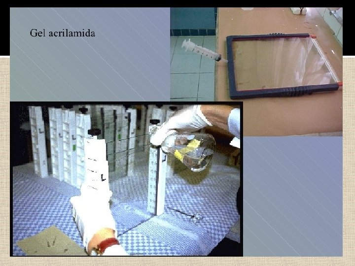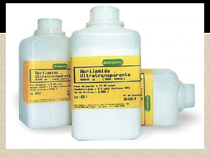 GEL DE POLIACRILAMIDA PARA ANÁLISE DE ÁCIDOS NUCLEICOS �Os géis de poliacrilamida são usados para separação de proteínas e pequenos fragmentos de DNA e RNA (cerca de 5 a 500 pb). � A poliacrilamida também pode ser usada quando pequenas quantidades de DNA ou RNA são analisadas ou quando é necessária uma maior resolução do que a obtida com o uso de géis de agarose.
