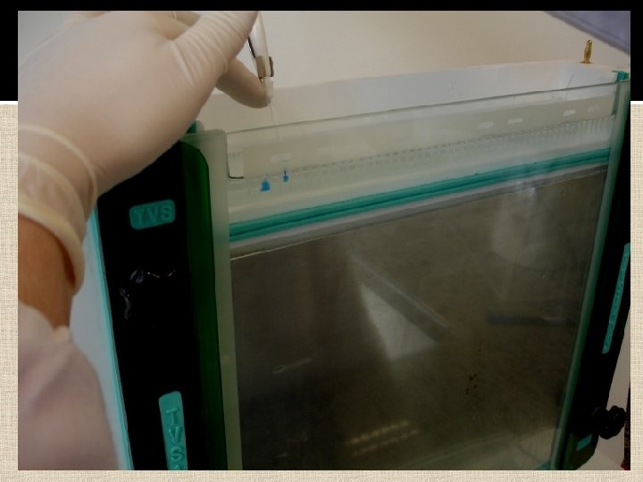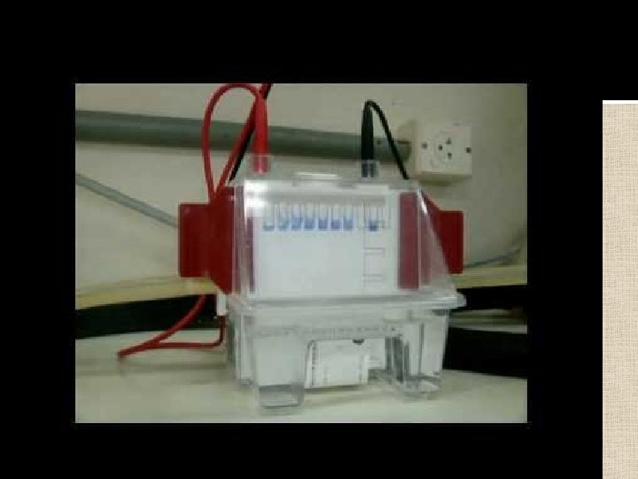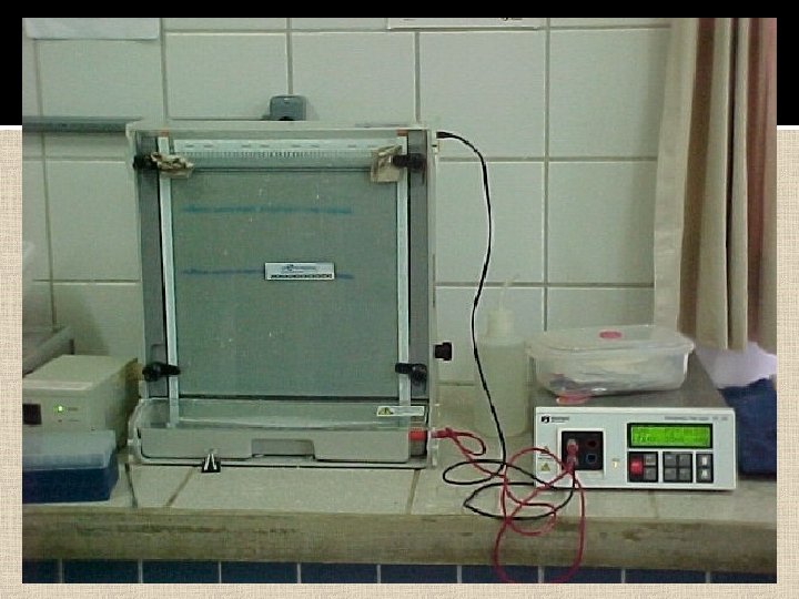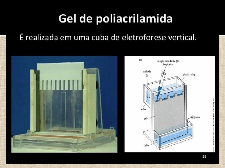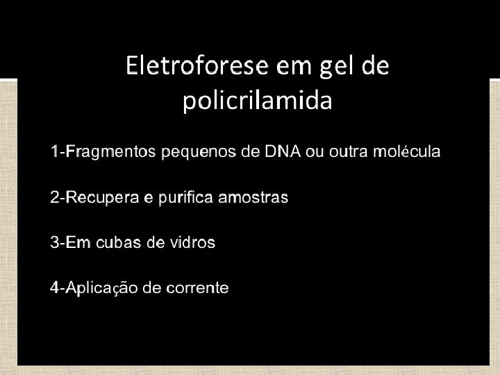 Características �O tamanho do poro do gel é determinado pela porcentagem total de acrilamida (entre 3, 5 e 20%) e pela razão desta em relação a bisacrilamida(uma molécula de bisacrilamida para cada 29 monômeros de acrilamida). �Caso as amostras a serem analisadas contenham uma mistura de ácidos nucleicos com grande variedade de peso molecular, é possível usar um gel com gradiente de concentração.