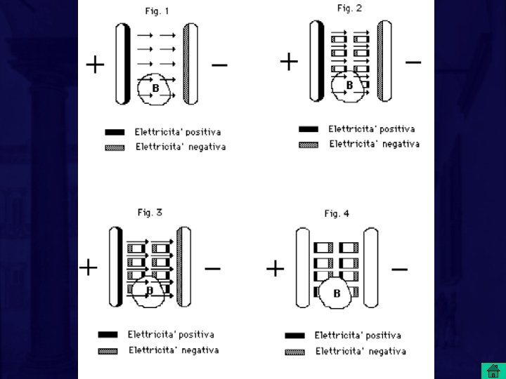 • Le cariche sulle piastre determinano le forze, indicate dalle frecce, che comunque non modificano il mezzo interposto; "non importa se lo spazio tra le piastre è pieno o vuoto. " Ad esempio, se svuotiamo la parte B di spazio, in essa la forza permane inalterata. Il potenziale è in un certo modo un ausilio per rappresentare le forze nei punti circostanti le cariche, ma il mezzo non influisce sull'andamento delle interazioni. Questo secondo punto di vista può essere da noi attribuito alle scuole dell'azione a distanza con velocità finita. In esse furono formulate equazioni di forza che modificavano il modello newtoniano introducendo termini dipendenti dalla velocità e dalla accelerazione delle cariche, che sono la sede e la sorgente della forza. • Il concetto di carica si andò quindi delineando dal modello di fluido (di uno o più tipi) al modello particellare, che era stato introdotto per la prima volta da Weber nel 1846 ancora in un contesto di azione a distanza con velocità infinita. Nelle equazioni della forza furono in seguito introdotti dalle scuole dell'azione a velocità finita termini indicanti appunto il ritardo nella propagazione dell'azione. Vale la pena di notare come l'attuale interpretazione di Feynman si riallacci tuttora a questo punto di vista.