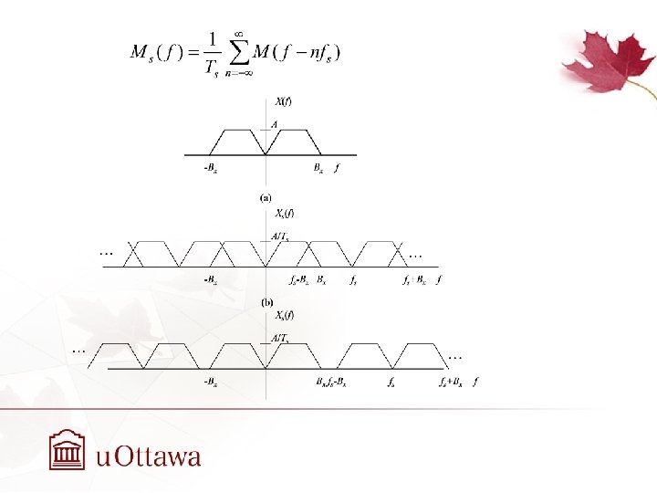 Théorie d’échantillonnage • Prenons un signal analogique m(t) avec une largeur de bande Bm. – Le signal échantillonné est ms(t): • où Ts = 1/fs est l’intervalle d’échantillonnage et fs est le taux d’échantillonnage. La transformée de Fourier du signal ms(t) est: