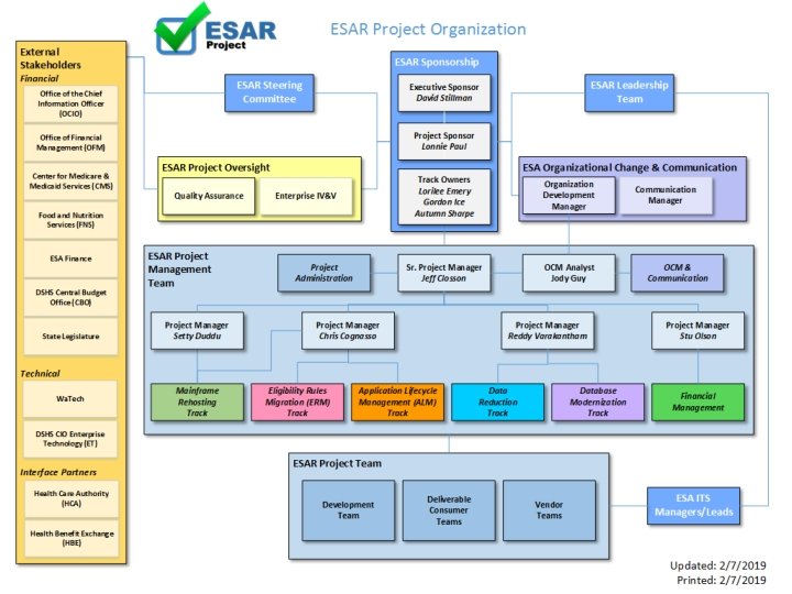 ESAR Vision: Improved operations through modernized infrastructure. Sponsored by: Application Lifecycle Management | Feb 2017 - TBD Improving the tools and processes that support the Software Development Life Cycle (SDLC) Data Reduction | May 2017 - Apr 2019 Reduce the inventory of reports and data to minimize potential security exposure as well as the effort for other ESAR project tracks Mainframe Rehosting | Jan 2019 - Dec 2020 Executive Sponsor: David Stillman, Assistant Secretary, Economic Services Administration Project Sponsor: Lonnie Paul, Interim Director, Information Technology Services Project Manager: Jeff Closson, Senior Project Manager, ESAR Project Reduce the dependency on legacy mainframe technologies; make the system more adaptable to future modernization. Database Modernization | Jul 2017 - Jun 2023 Provide a new normalized relational database and related code changes to the ACES complex. Eligibility Rules Migration | TBD Provide a single, integrated Business Rules Management System (BRMS) that includes all eligibility decisions allowing for faster and more accurate changes to the system.