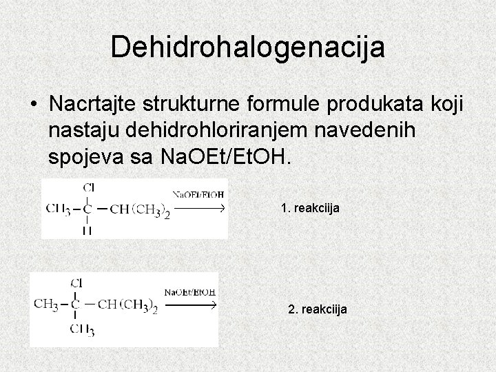Dehidrohalogenacija • Nacrtajte strukturne formule produkata koji nastaju dehidrohloriranjem navedenih spojeva sa Na. OEt/Et. OH. 1. reakciija 2. reakciija