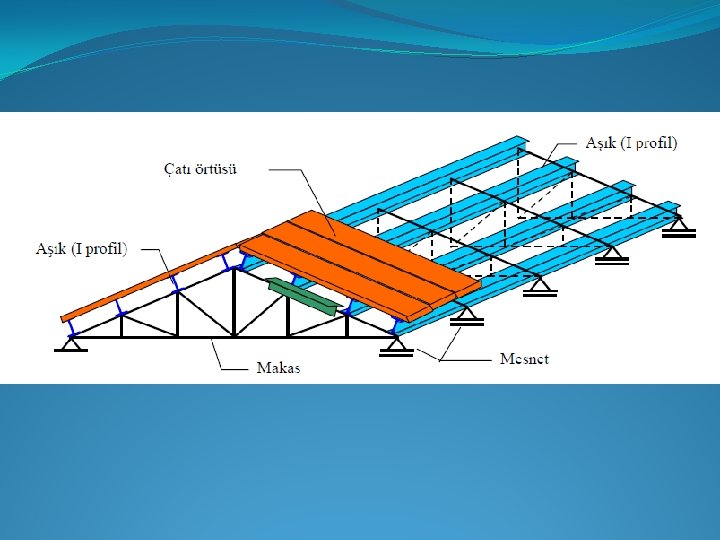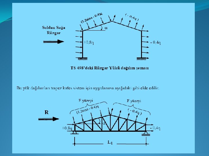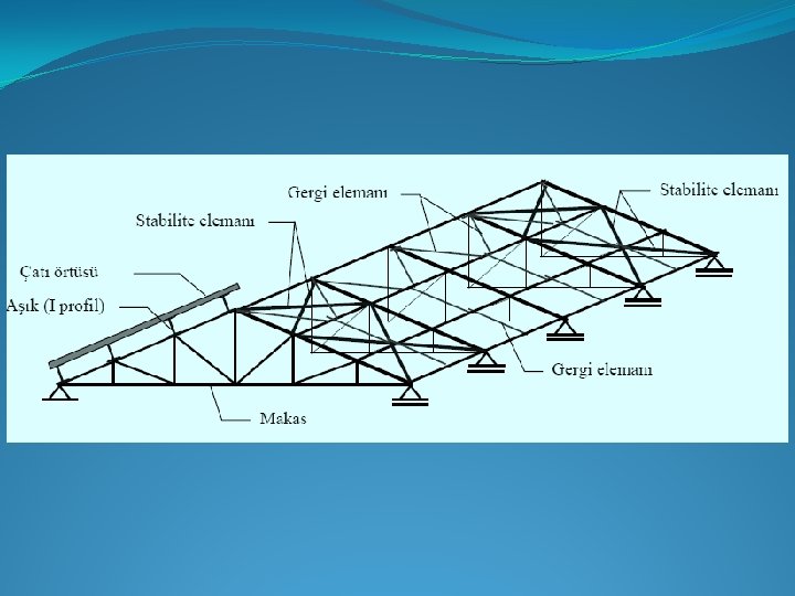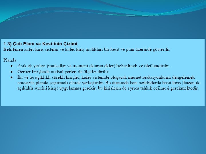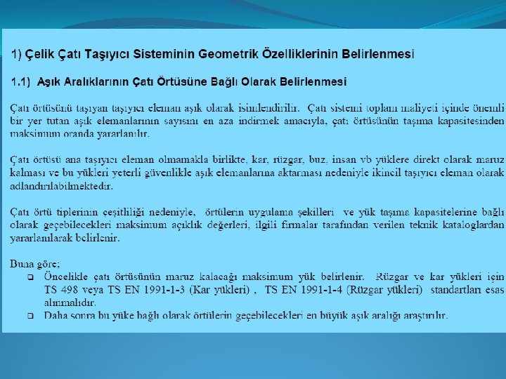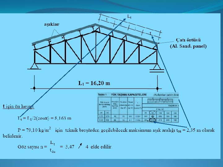 �Örnek Projemizde: Bu örtü tipine ve yapı uzunluğumuza (L 2 = 68, 6 m çıkmıştı) göre ilk L 0 = 6 m seçildi. Bir sonraki sayfadaki açıklamaya bakınız. 68, 6 (0, 83 L 0) 6 10 n = 9, 77 = 10 olarak bulunur. Bu değer tekrar formülde yerine konup bu sefer L 0 çekilirse: 68, 6 = 2(0, 83 Lo)+10 Lo L 0 = 68, 6/11, 66 = 5, 883 m Lk = 0, 83 x 5, 833 = 4, 883 m Kafes kiriş sayısı = 10 + 3 = 13 Lk Lo Lo Lo Lk