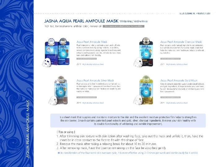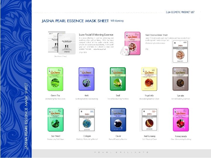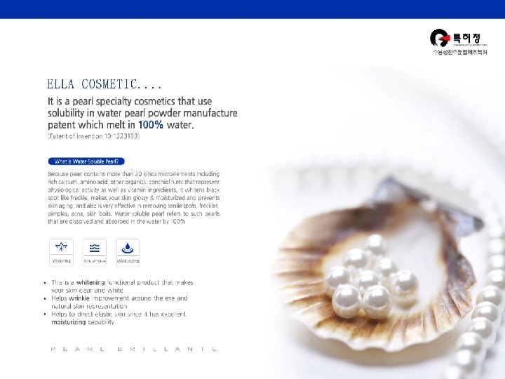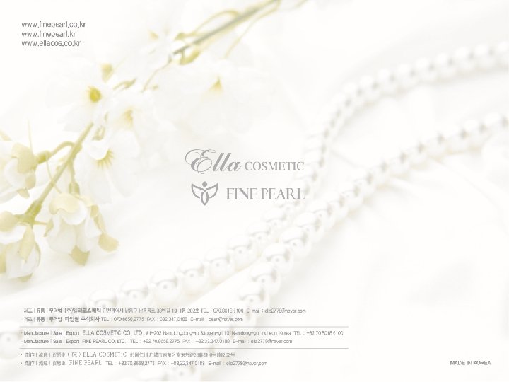 ELLA COSMETIC… ELLA COSMETIC is the only pearl-themed Korean cosmetics brand offering products made from pearl, natural oriental herbs and vegetable extracts. (Acquired patents for developing water-soluble pearl powder and pearl powder products) The brand has sold their skincare products in the US market for a long time, which helped further upgrade their product quality, and is now seeking to enter the Asian markets including China, Hong Kong, Japan, Vietnam, as well as the Central-South America. ELLA COSMETIC is committed to making best quality cosmetics products through constant research and dedication, under our vision to pursue elegant, gem-like beauty similar to what pearl has. .