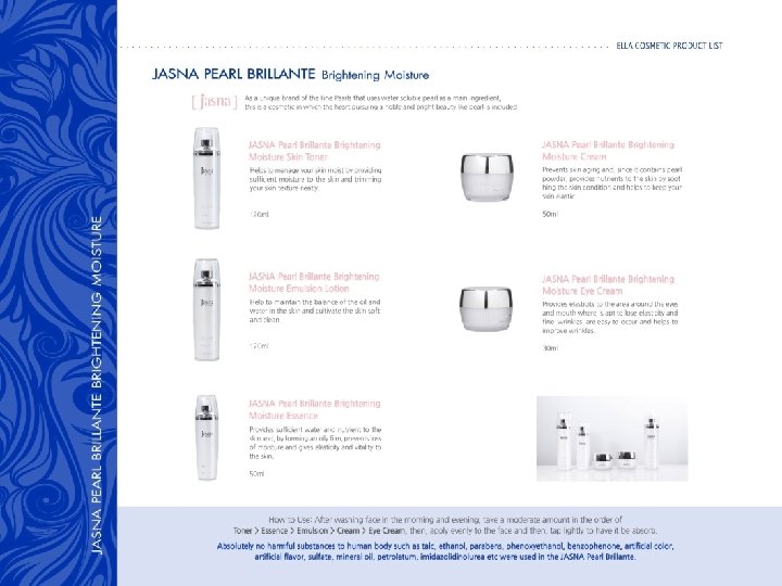 JASNA PEARL SERIES PRODUCTS Jasna is a unique sub-brand of ELLA COSMETIC, which uses water-soluble pearl powder as main ingredients of its products. The brand represents our vision of pursuing elegant, gemlike beauty. Jasna Pearl Collagen Cream [Functions & Effects] Excellent moisturizing effect by providing nutrition and moisturizing to your skin. Helps makes your skin more elastic and softer. [How to Apply] Take sufficient amount of the cream and apply it smoothly and evenly over your face. [Volume] 50 ml Jasna Natural Plant cell Pearl Ampoule Kit [Functions & Effects] Prevents stains and freckles as well as melanin cell development by using arbutin, vegetable stem cells, cabbage extracts, and pearl extracts. These nutrients have whitening, anti-bacterial, and moisturizing effects, and make your skin cleaner and more elastic through boosting cell reproduction. [How to Apply] Take sufficient amount of the cream and apply it smoothly and evenly over wrinkled areas. [Volume] 6 ml X 10 Jasna Pearl Anti-wrinkle Cream [Functions & Effects] Improves wrinkled skin especially around eyes and lips. Provides moisturizing and nutrition to your skin to reduce the wrinkles and keep it well-moisturized. Jasna Bubble Foaming Cleanser [Functions & Effects] The fine, plentiful particles in the foam help wash off dirt from deep inside your skin. The soft foam helps effective moisturizing and cleansing of your skin. [How to Apply] Take sufficient amount of the foam and massage your face smoothly with it. Wash off with warm water. [Volume] 200 ml Take sufficient amount of the cream and apply it smoothly and evenly over your face. 30 ml
