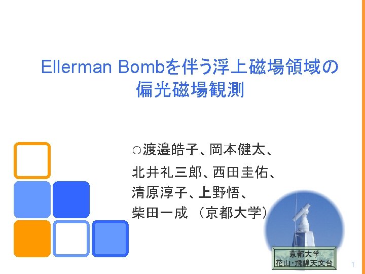 飛騨天文台でのEllerman Bombの観測 p Kurokawa et al. (1982) – 楕円型、サイズ: 800 km x 400 km p Kitai ドームレス太陽望遠鏡 Hα-0. 8Åの画像 et al. (1983) – Hα profile: 彩層中の温度と密度の高い、 上昇しているlayerで形成される p Matsumoto et al. (2008) – Ellerman Bombの上空にHαサージを観 測 p Watanabe 15000 km Hα profile of an EB et al. (2008), submitted – 偏光磁場観測装置(Vector magnetograph)を用い た活動領域の長時間観測 3