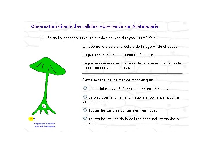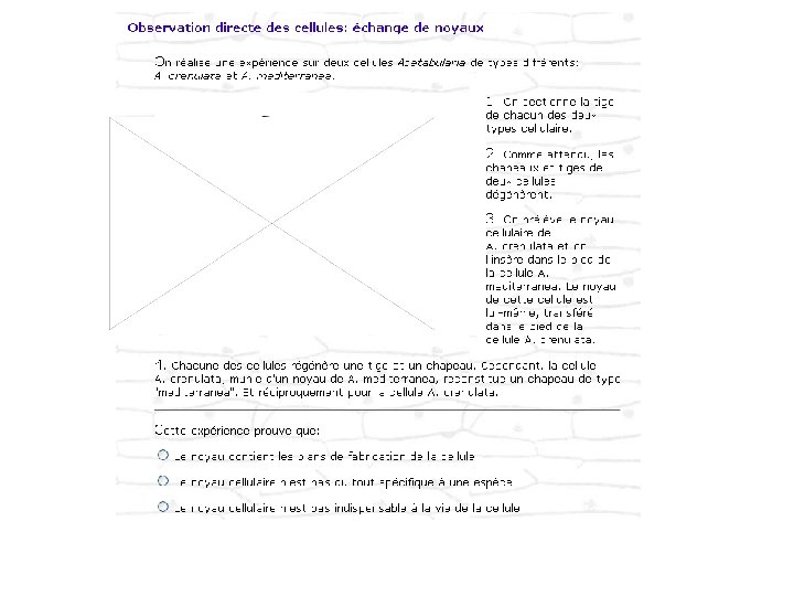 1. 2. 3. 4. Exactement, puisque le noyau 'crenulata' provoque la formation d'un chapeau 'crenulata’ et le noyau 'mediterranea' provoqe la ormation d'un chapeau 'mediterranea'. Au contraire, l'expérience montre que le noyau est très spécifique. Par exemple, le noyau 'crenulata' reste crenulata même si on l'introduit dans un autre type cellulaire. Pour vérifier cette hypothèse, il faudrait observer des cellules énucléées. Ici, aucune conclusion en ce sens n'est possible.